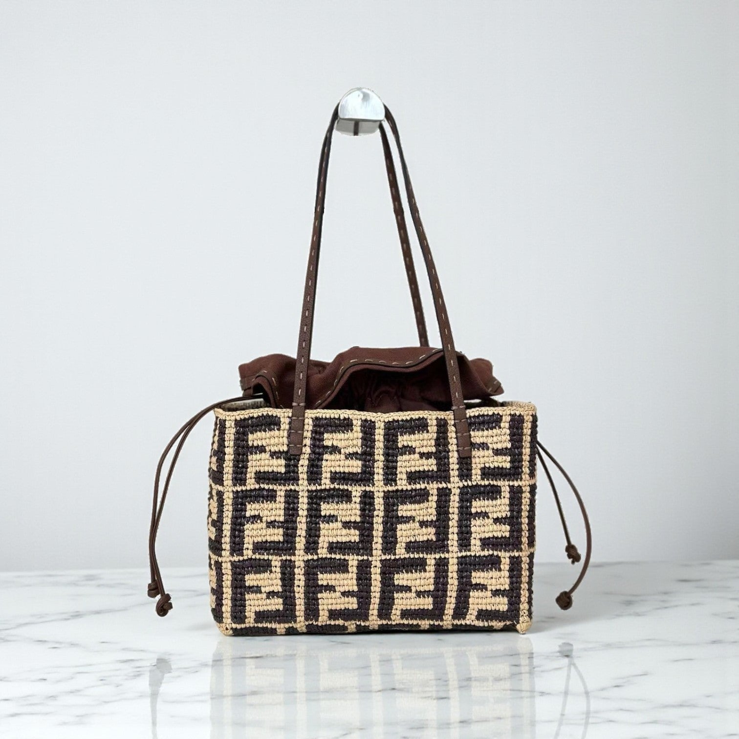 Fendi Roll Bag 40cm Brown FF Print Raffia Crochet Shopper