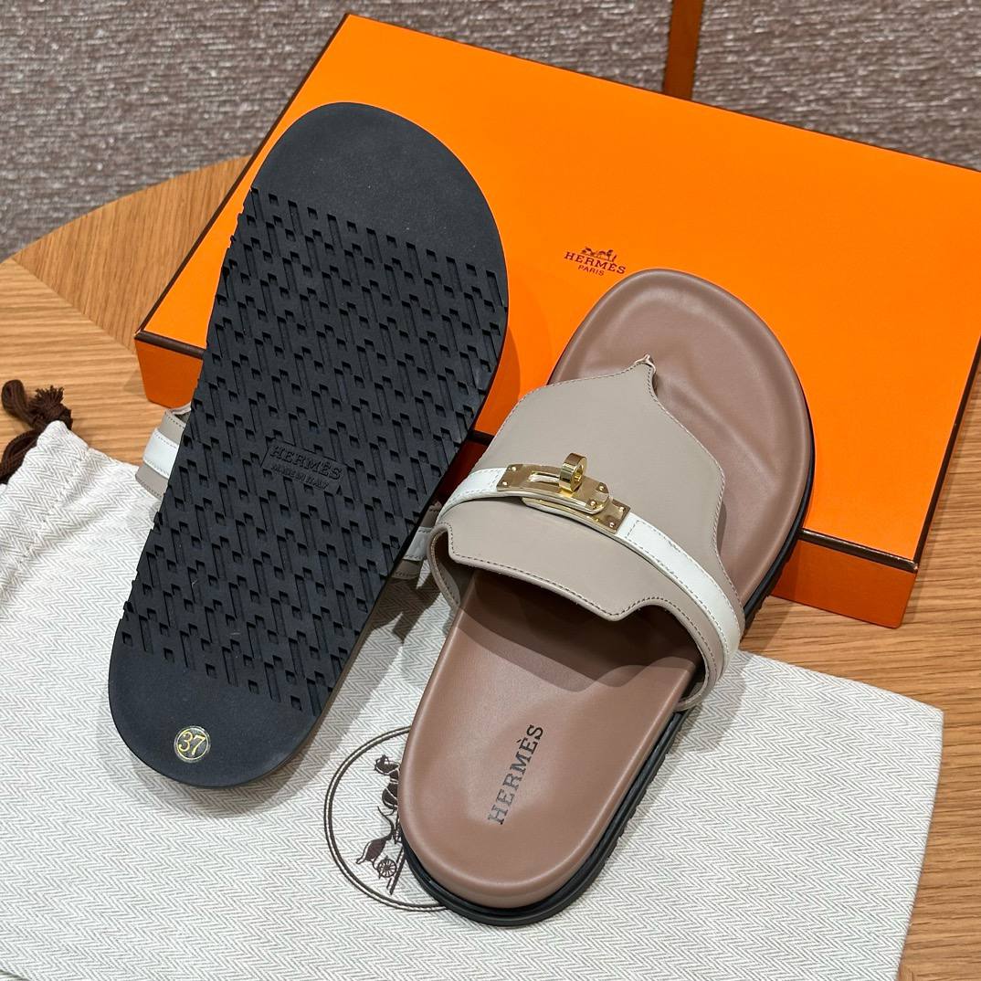 Hermes Empire Sandals, Gold Hardware, Grayish-yellow Beige, Calfskin, Rubber Outsole
