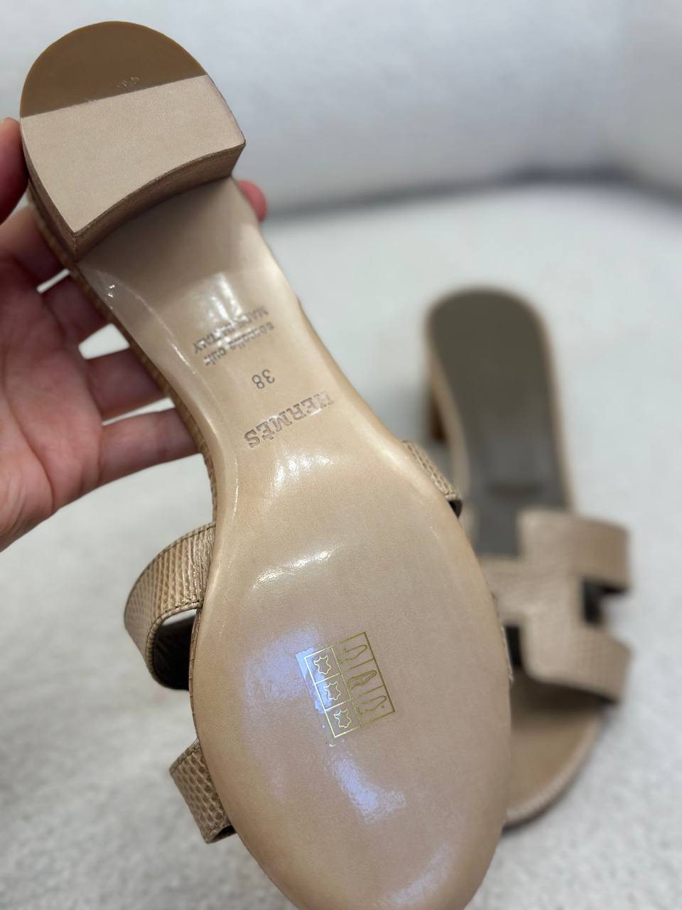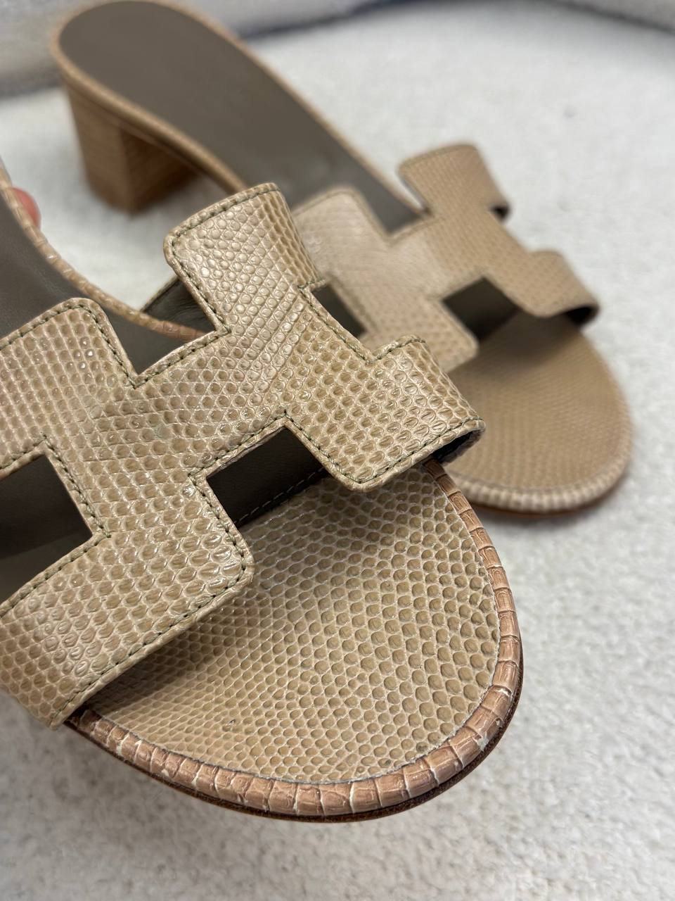 Hermes Oasis Lizard Sandal, Lizard Leather, 1.5" Heels, Leather Damage & Damaged Box