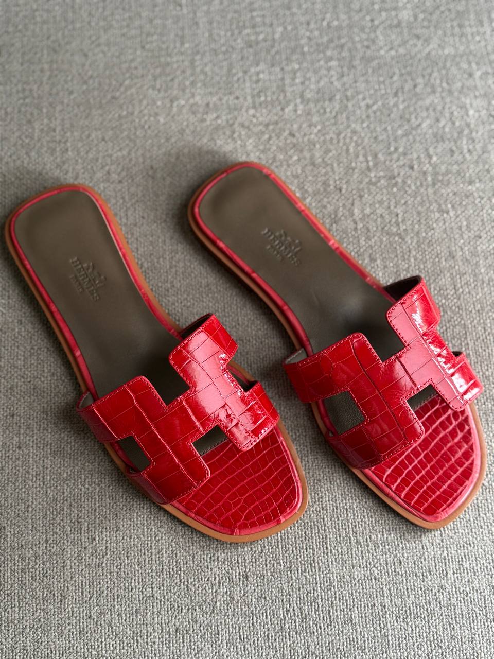 Hermes Oran Sandal Crocodile – Red, Patent Crocodile Leather Upper, Dermal Outsole